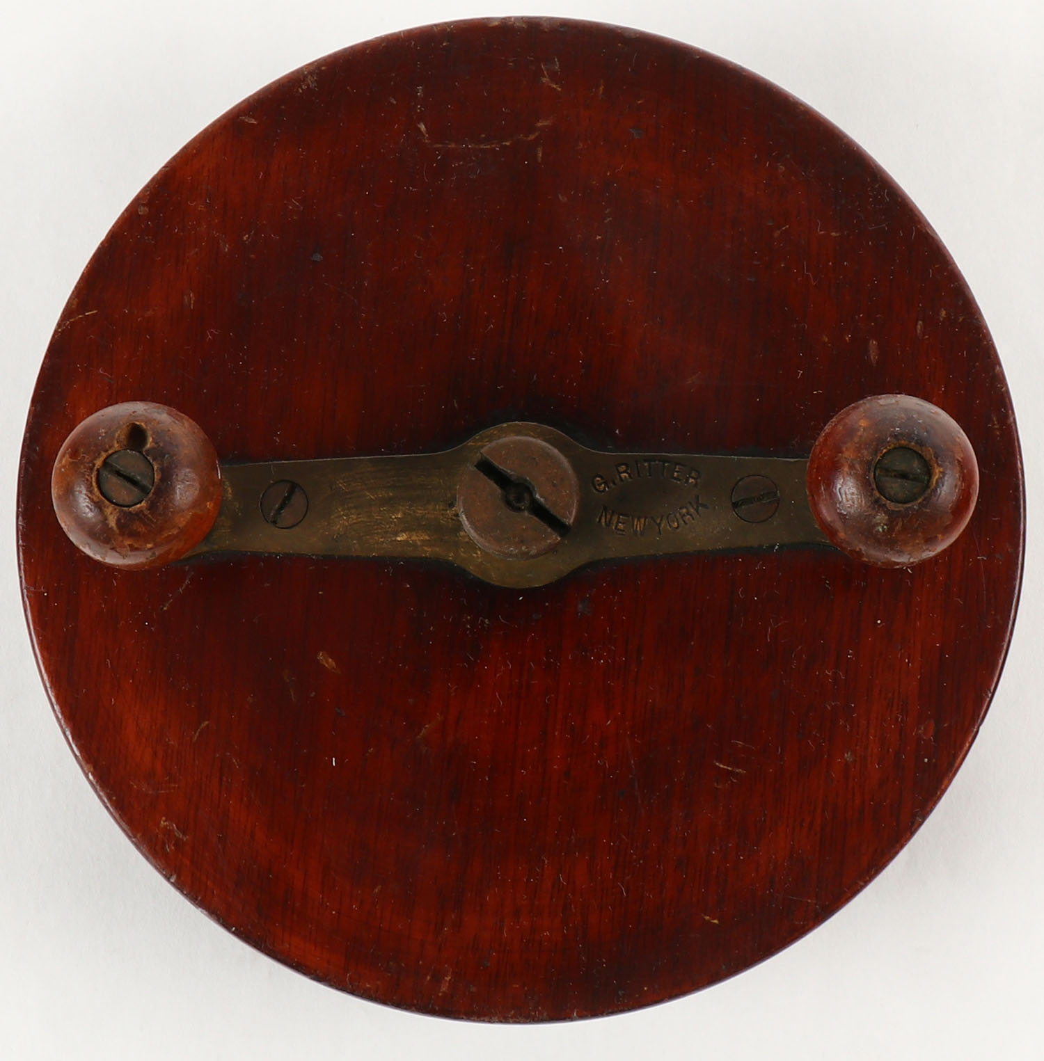 G. Ritter NY. wood/ brass fly reel, dual handles, 6'' dia, shows some wear, nice early reel. Grade: Excellent - Value: 20 to 80