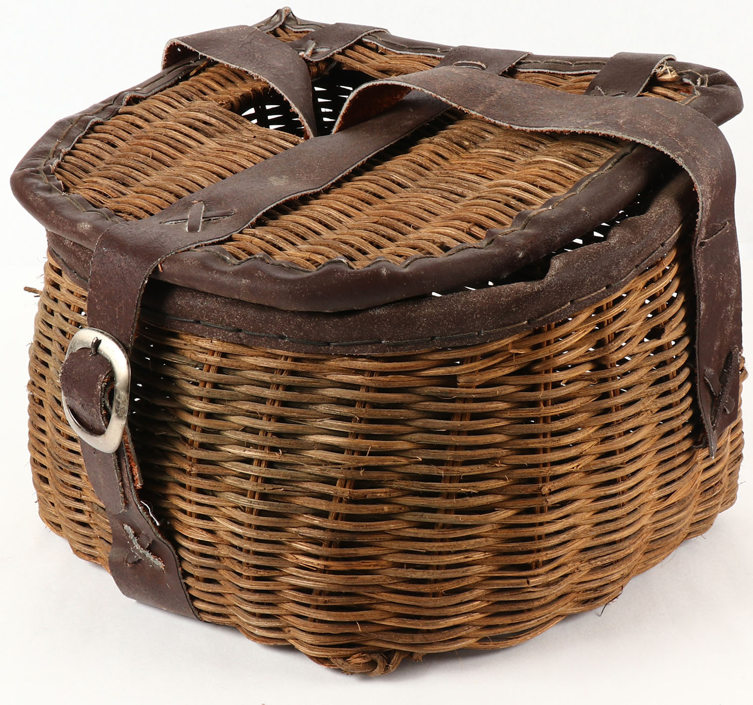 Unmarked fishing creel, has leather buckle on front & strap, 12'' wide & 10'' deep. Grade: Excellent - Value: 10 to 50