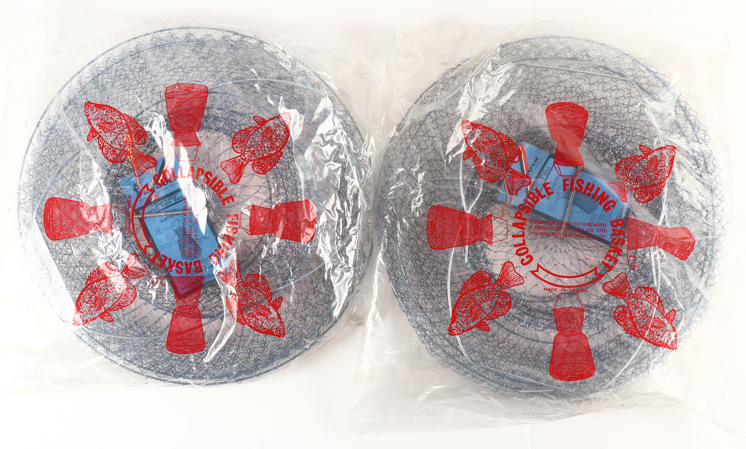 Lot of 2 brand new collapsible fish holding baskets in the original plastic warping, circa 1990's. Grade: MINT - Value: 10 to 30