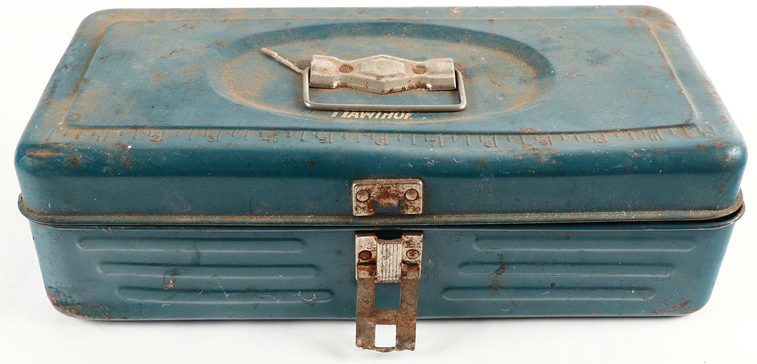 Montgomery Ward's Fishing Tackle box full of lures & gear, latch is broken. Grade: Very Good - Value: 6 to 30