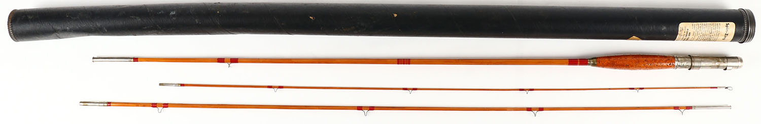 Nep-Tuna bamboo fly rod,, Steel Vine, , 9' 6'', 6wt?, 3/1 (the tip is about 6'' shorter than the other pieces), rod is very nice with wonderful wraps, cork is very nice but has a coat of lacquer, marked cardboard tube. Grade: Very Good ++ - Value: 20 to 100