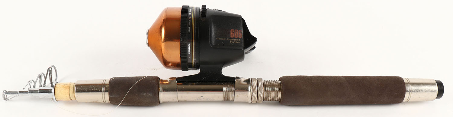 Unmarked collapsible fishing rod, 6', fold to 16'', has Zebco reel. Grade: Very Good ++ - Value: 2 to 30