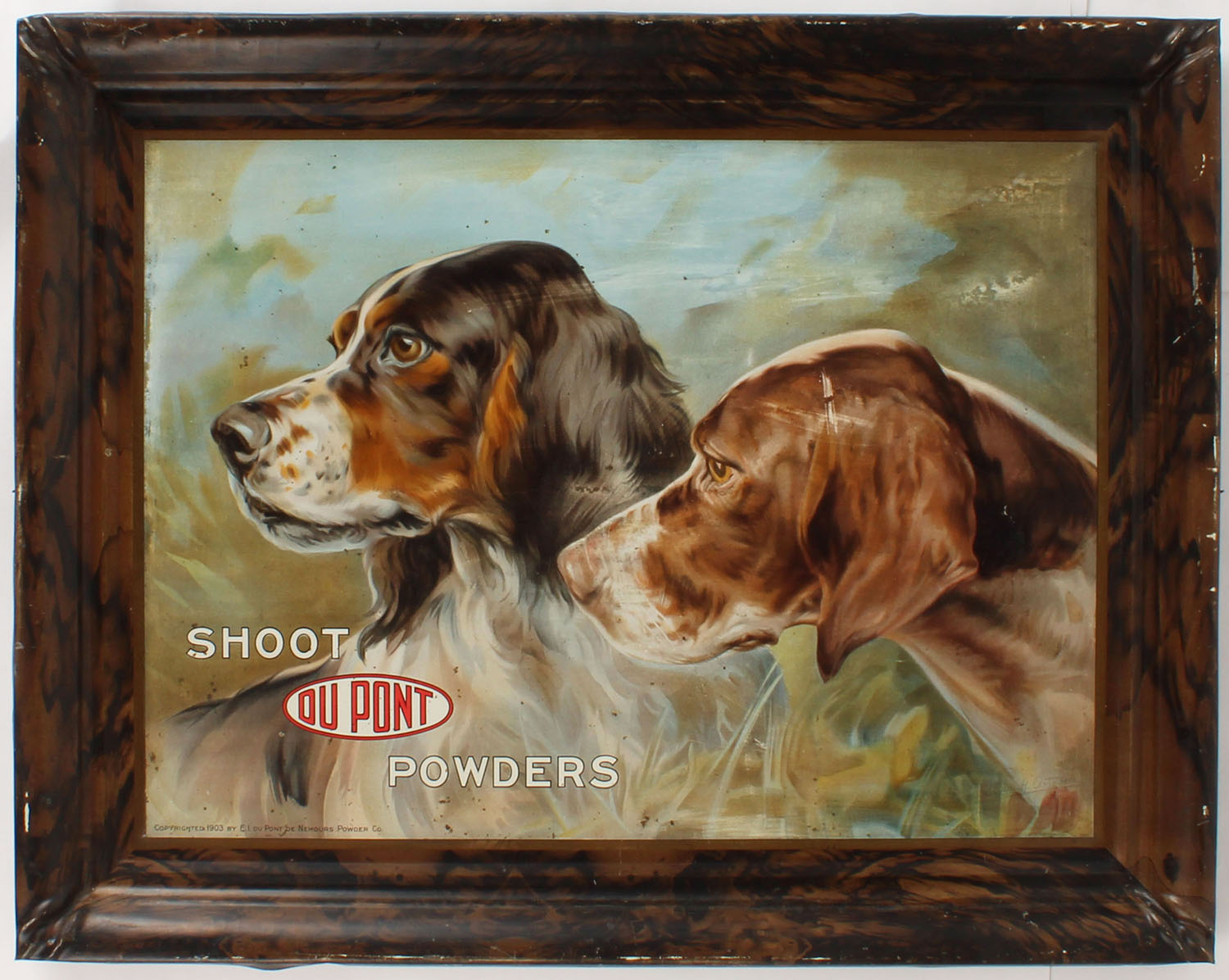 SHOOT DUPONT POWDERS Tin Chromolithograph sign, self-framed, tin dated 1903 and marked Shoot DuPont Powders Artwork by Edwin Osthaus. Overall size is 28 1/4'' X 22 1/4'', has great colors with very few scratches. Grade: Excellent - Value: 1000 to 3000