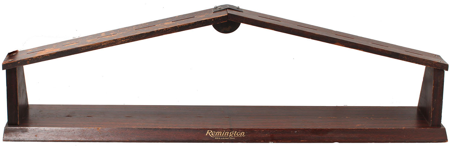 RARE Remington UMC Counter Knife display, has REM UMC red dot logo on each side, has Remington in gold lettering on the front & back of wood base, has heavy metal REM UMC red dot logo at the top, this was use to display kitchen knives from the top standing upright, holds 11 total knives, 33'' x 9 1/2'', shows some wear to surface paint only & most of that is to the top, Very Rare & only one we have seen! Grade: Excellent - Value: 250 to 500