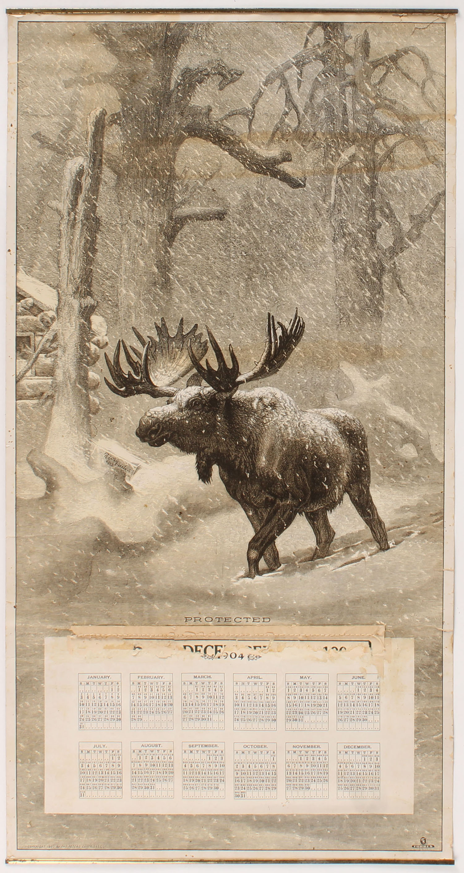RARE 1904 Peters Calendar, ''PROTECTED'', pictures bull moose in driving snow scene, has metal bands top or bottom, no pages, 14'' x 26 1/2'', shows light edge wear & one light water stain to top but hard to see because of the sepia tones, EXTREMELY RARE & ONLY ONE WE HAVE SEEN! Grade: Very Good ++ - Value: 1000 to 5000