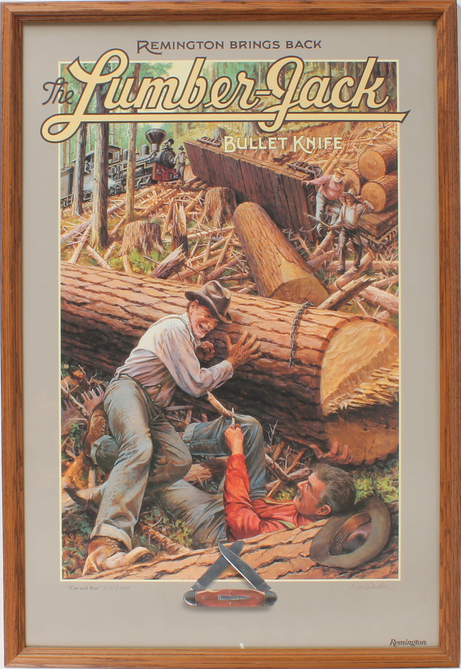 Remington Bullet Knife Poster, ''The Lumber Jack'', ''CUT AND RUN'', 1125-2000, near perfect condition, pictures loggers using knife to cut away pants so the logs falling wont run over them, 20'' x 30'', framed. Grade: MINT - Value: 40 to 200
