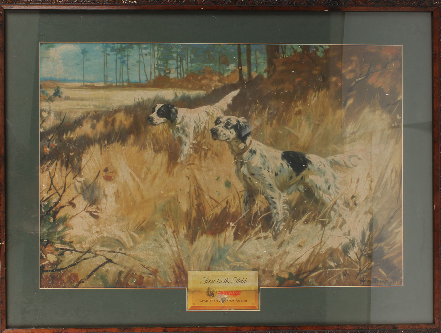 Savage ''First In The Field'' Diecut, pictures english setters on point, has nice colors with some wear, 26'' x 20'', framed. Grade: Very Good ++ - Value: 30 to 100