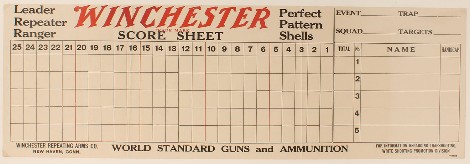 Large Winchester Score Sheet, used at trap shooting events, 38'' x 12 1/2''. Grade: Excellent - Value: 50 to 350