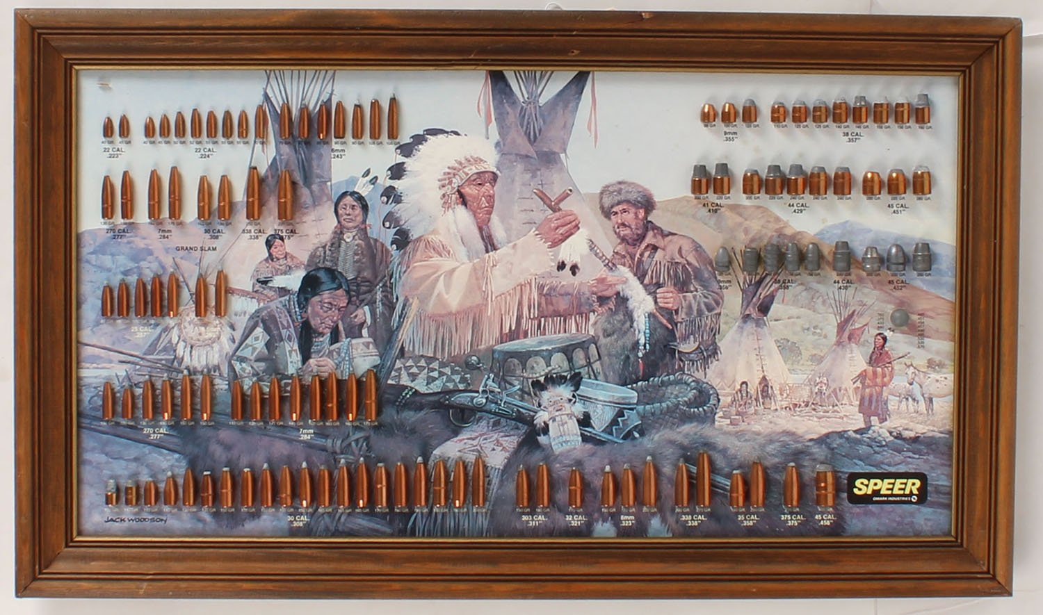 Speer Bullet Board, THE POTLATCH, pictures Indians and frontiersman trading, all bullets intact. Grade: Excellent + - Value: 70 to 250
