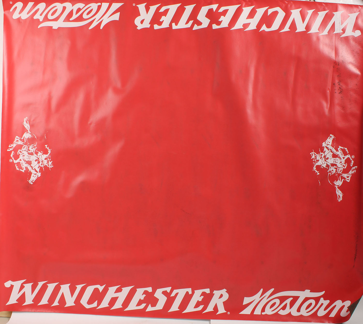 Winchester Table Banner, red & white, no foam on back, 54'' x 47'', shows some marks otherwise nice condition. Grade: Excellent - Value: 10 to 90
