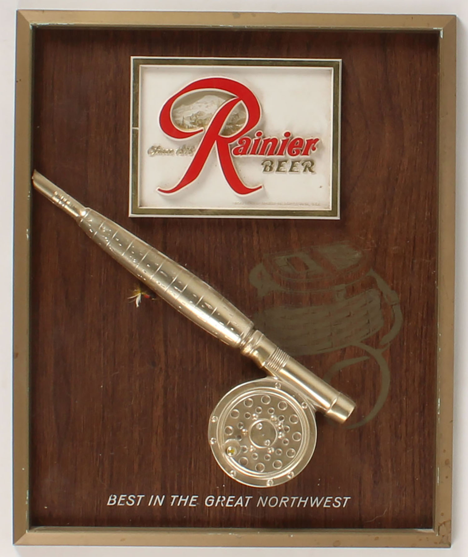 Rainier Beer fly fishing sign, 12'' x 14''. Grade: Excellent - Value: 6 to 40