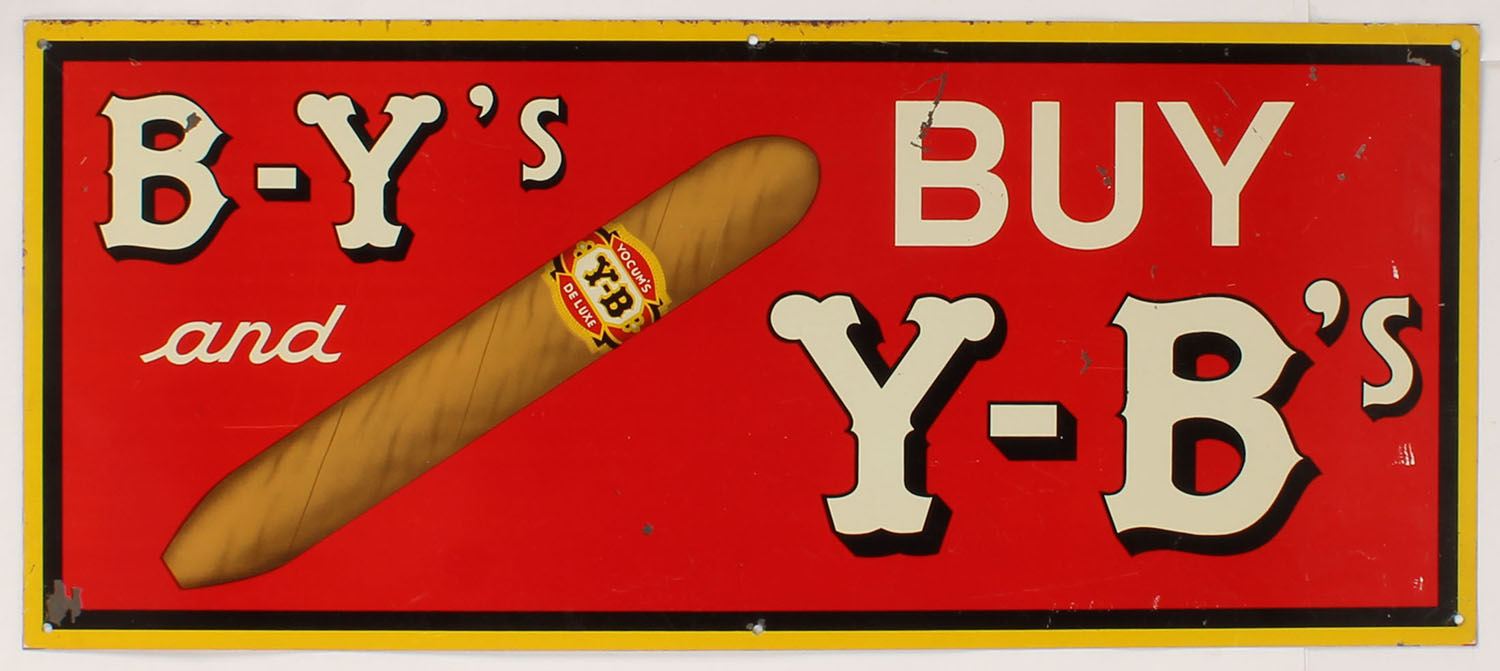 1930's Yocum Brothers Co. Y-B Cigar metal adv. Sign, 28'' x 12'', shows some scuff marks with great colors, has mounting holes in the corners. Grade: Excellent - Value: 100 to 300