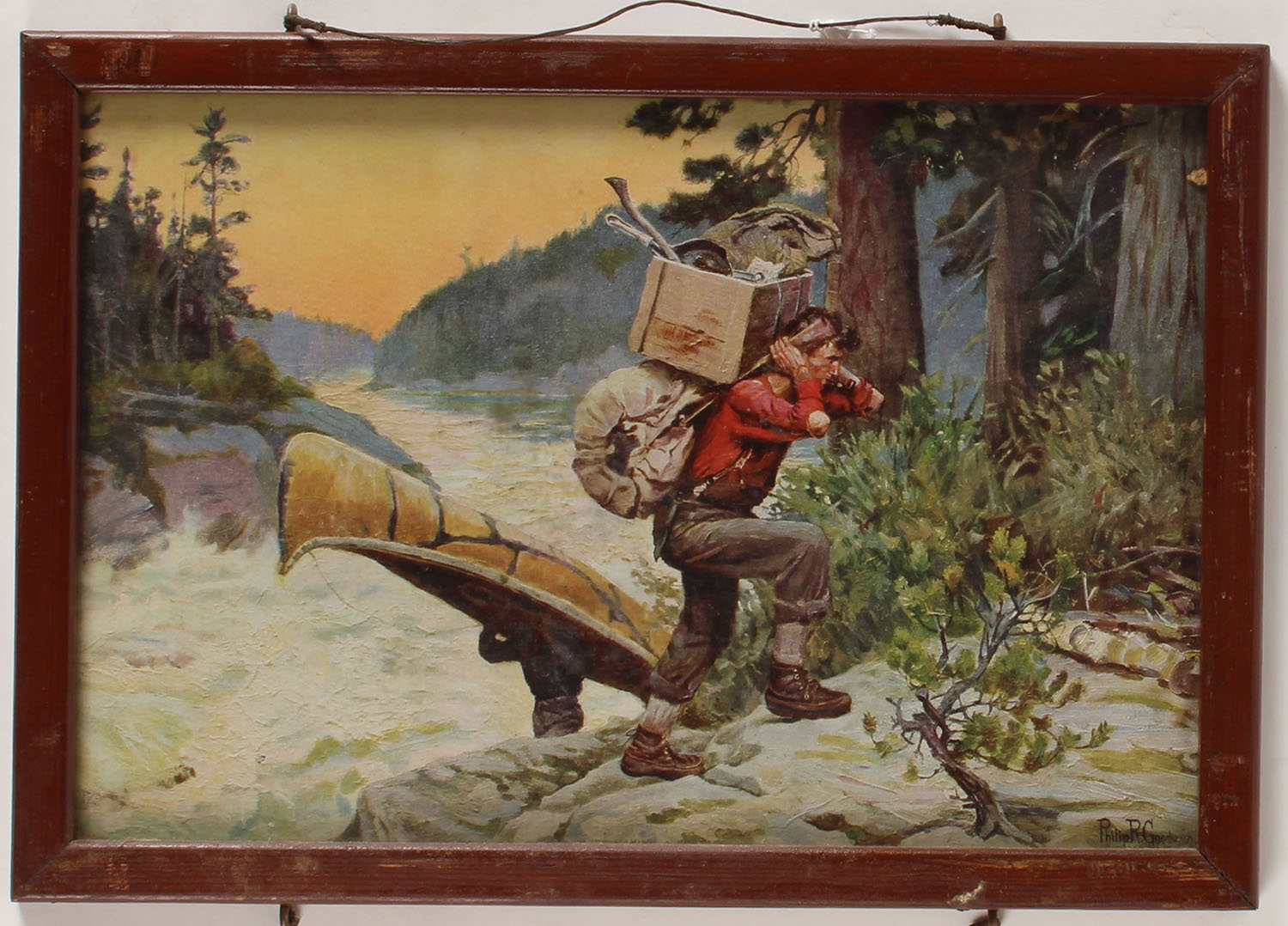 Philip R. Goodwin print, ''CURSERS MAKING A PORTAGE'', nice full color image of hunters packing their gear & birch canoe around some rapids, image size 14'' x 9''. Grade: Excellent - Value: 20 to 100