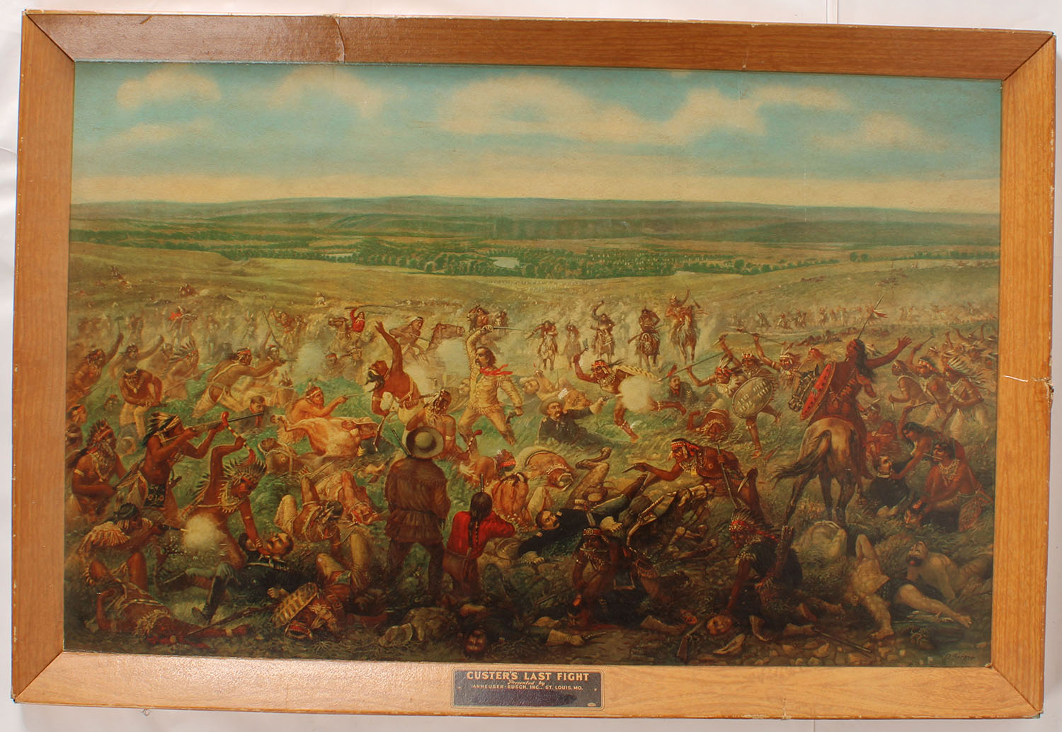 Custer's Last Fight by O. Beker, self framed image, pictures the battlegrounds of Custers last stand, image size 38'' x 24'', made of diecut material. Grade: Very Good + - Value: 20 to 100