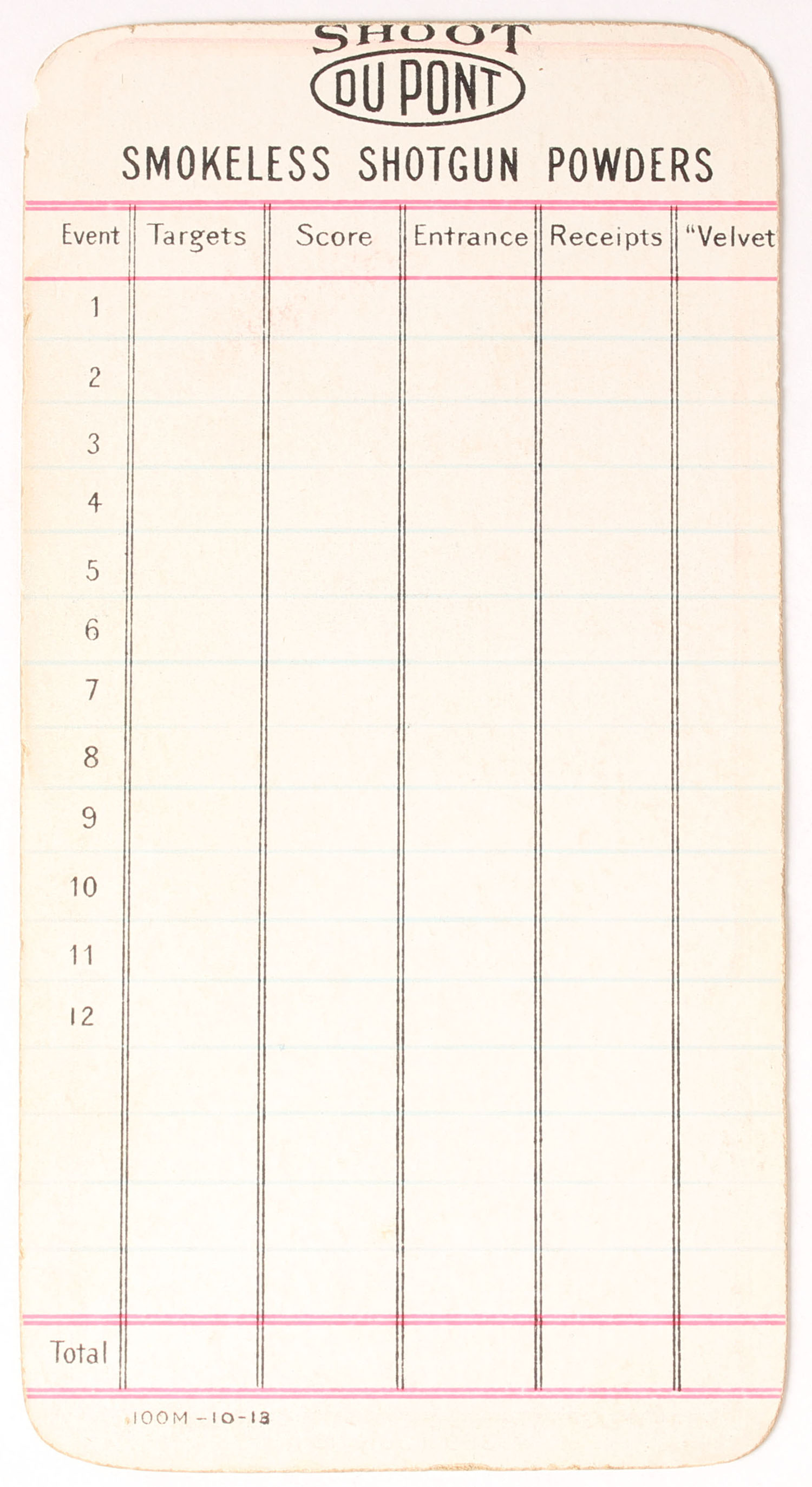 Dupont Ballistite Score Card, unused, has near mint image of trapshooter, back side has unused score card, 2 3/4'' x 5''. Grade: Excellent ++ - Value: 10 to 50