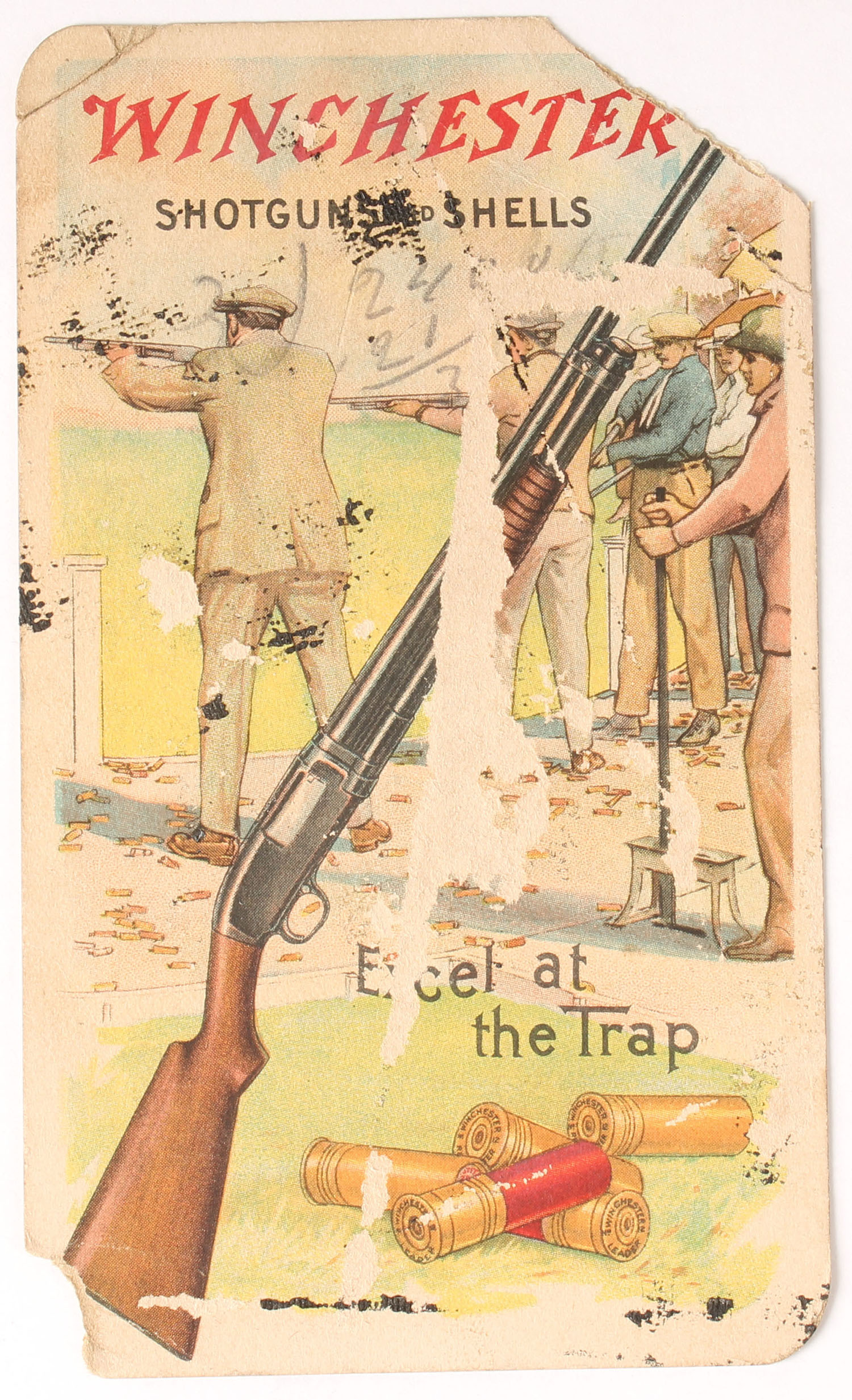 Winchester Leader and Repeater Score Card, used, has image of trapshooting scene, shows wear & scuffing, 3'' x 5 1/2''. Grade: Good + - Value: 6 to 30