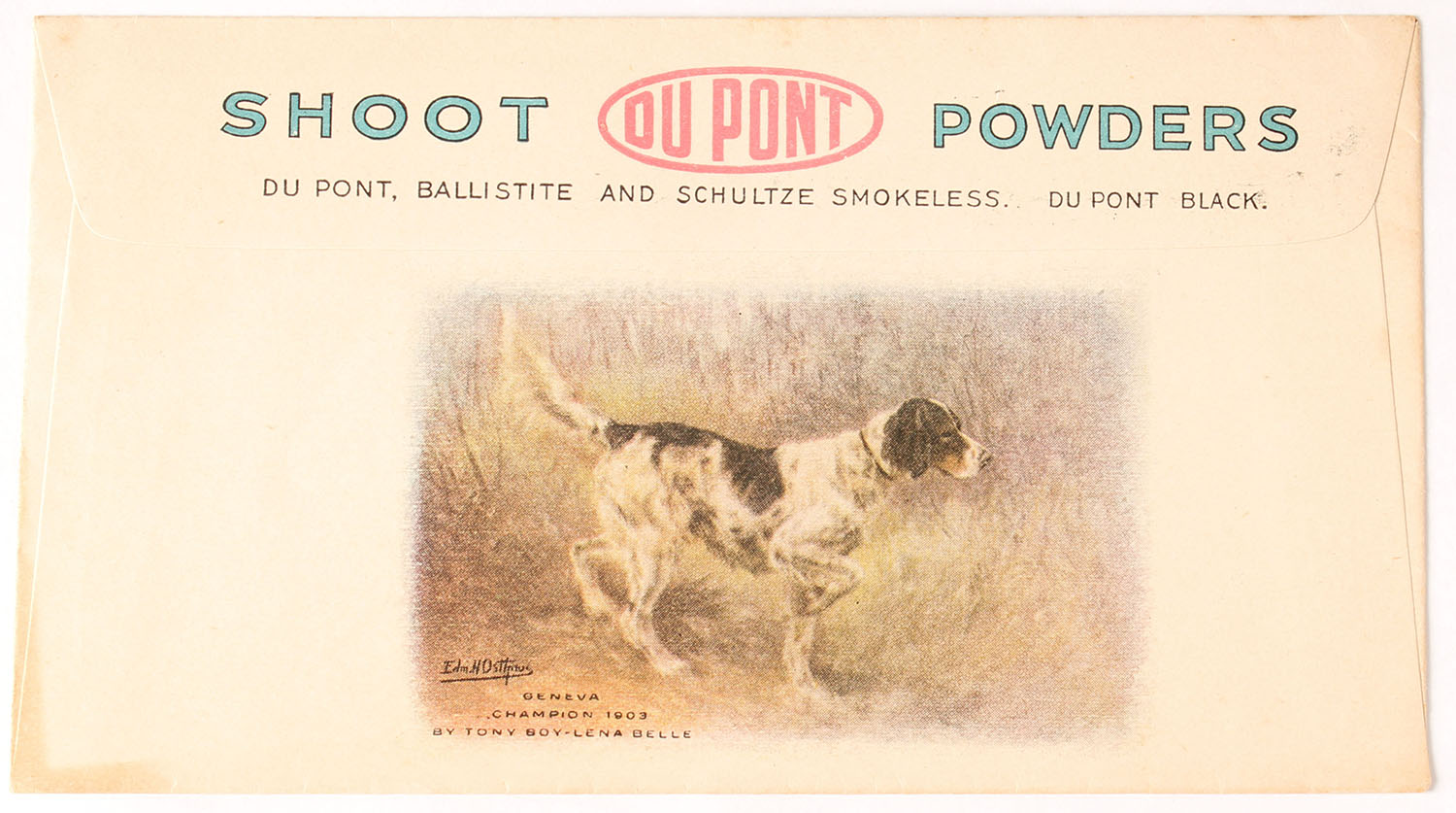 Shoot Dupont Powders Envelope, unused circa 1900, full color image on back of 1903 Champion GENEVA english setter on point, great colors. Grade: Very Good ++ - Value: 20 to 60
