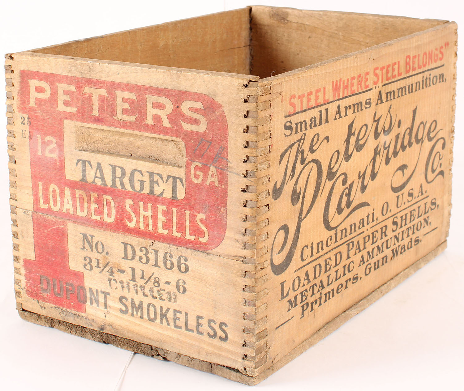 Peters wood shipping crate, Target, 12 ga., 6 chilled shot, tongue and groove construction, black and red print is solid, crate is bright and clean, Grade: Excellent ++ - Value: 40 to 80