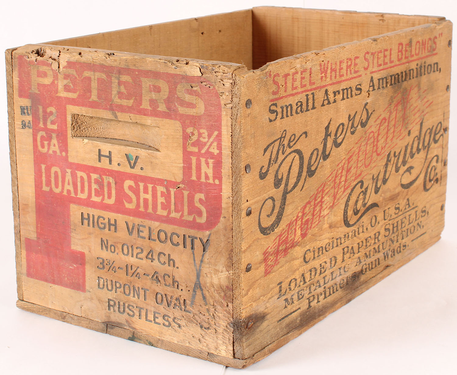 Peters wood shipping crate, High Velocity, 12 ga., 4 chilled shot, nail construction, black and red print is solid, crate has light age soiling, Grade: Excellent - Value: 30 to 60