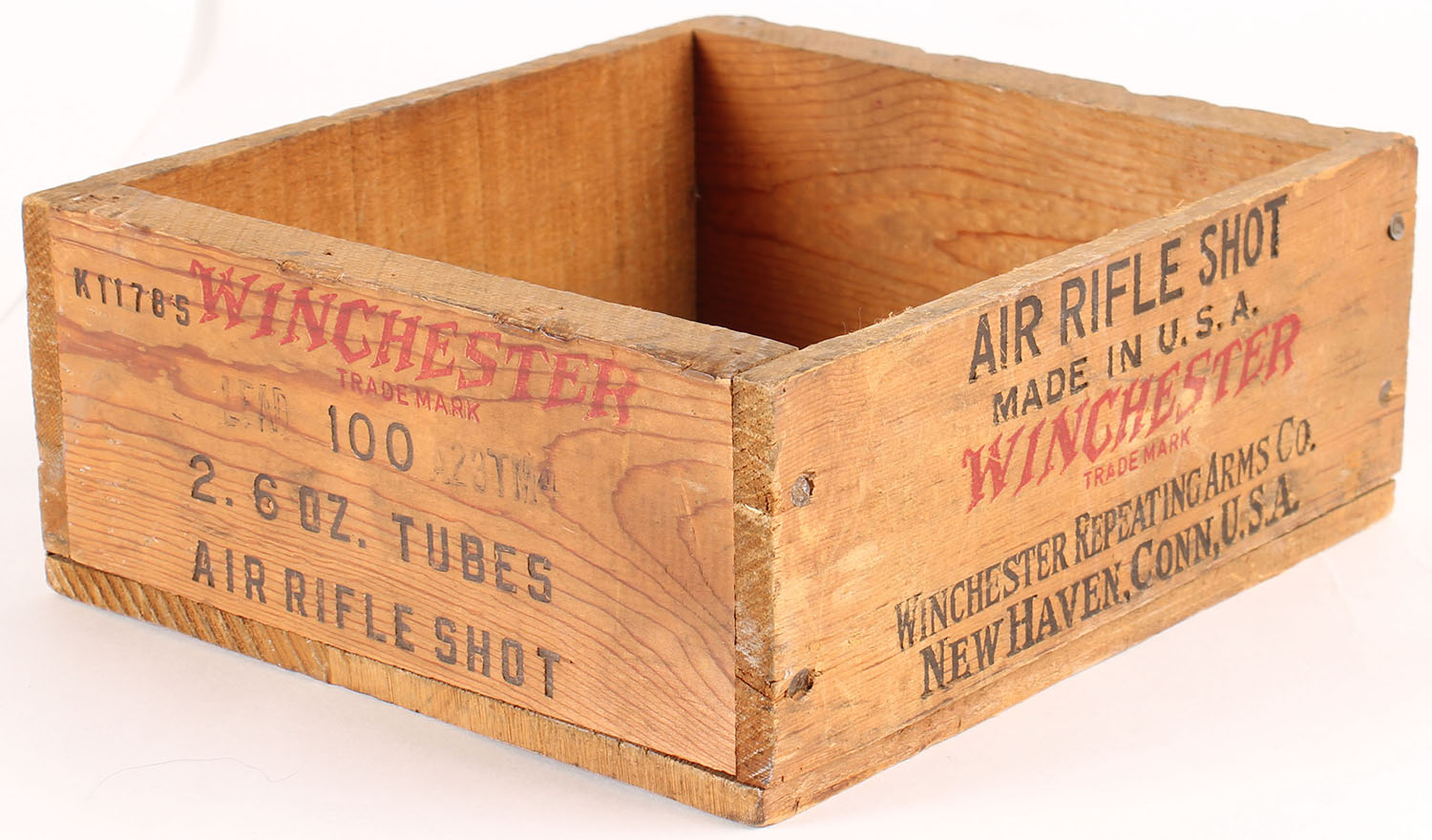 Winchester wood shipping crate, Air Rifle Shot, black & red print is bright and clean, crate is solid. Grade: Excellent - Value: 10 to 50