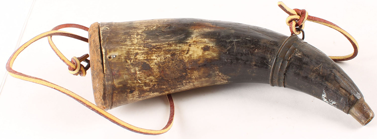 Powder horn, unmarked, 7'', Pat 1870, has age soiling. Grade: Excellent - Value: 20 to 80