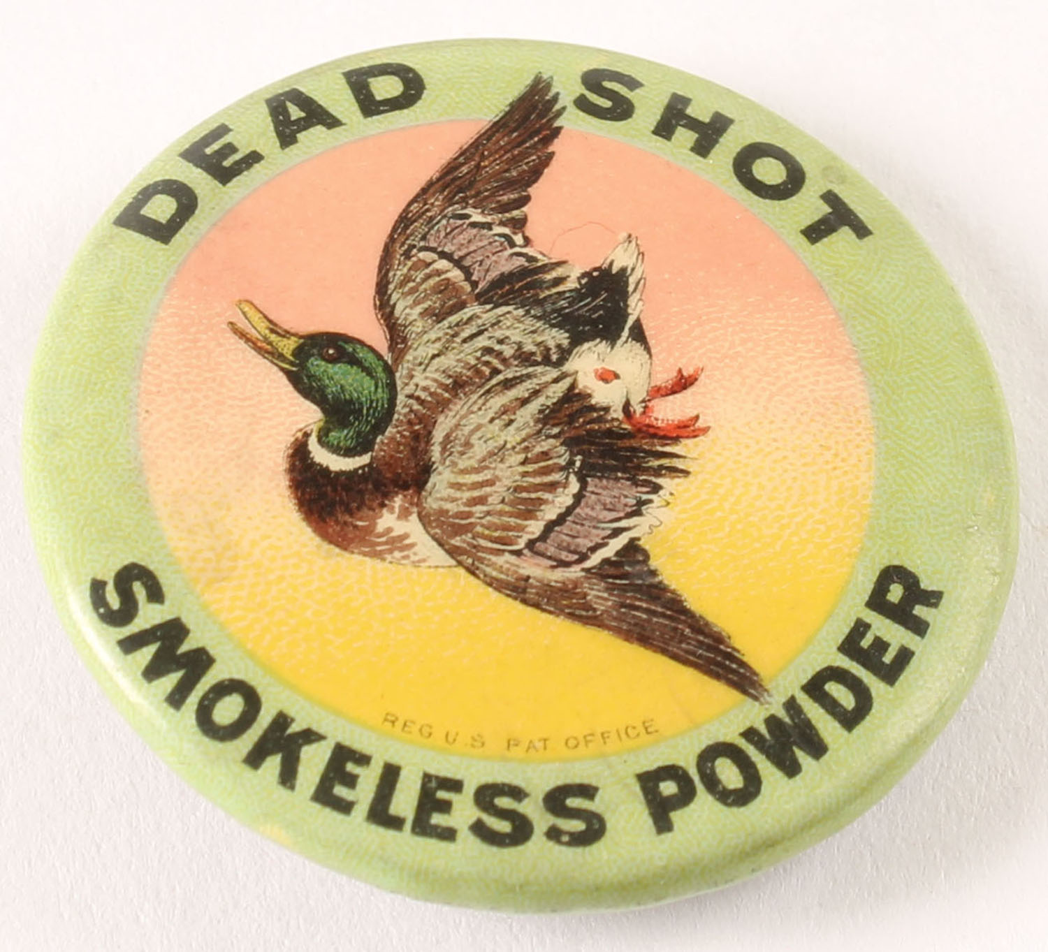 Large Dead Shot smokeless powder pinback, whitehead & Hoag. Grade: Excellent ++ - Value: 16 to 60