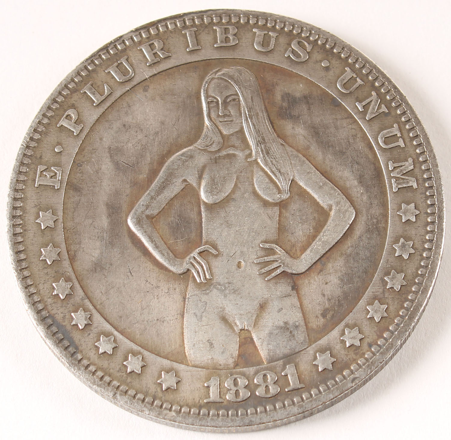 RARE! 1881 nude silver dollar coin with eagle on back. Grade: Ex...