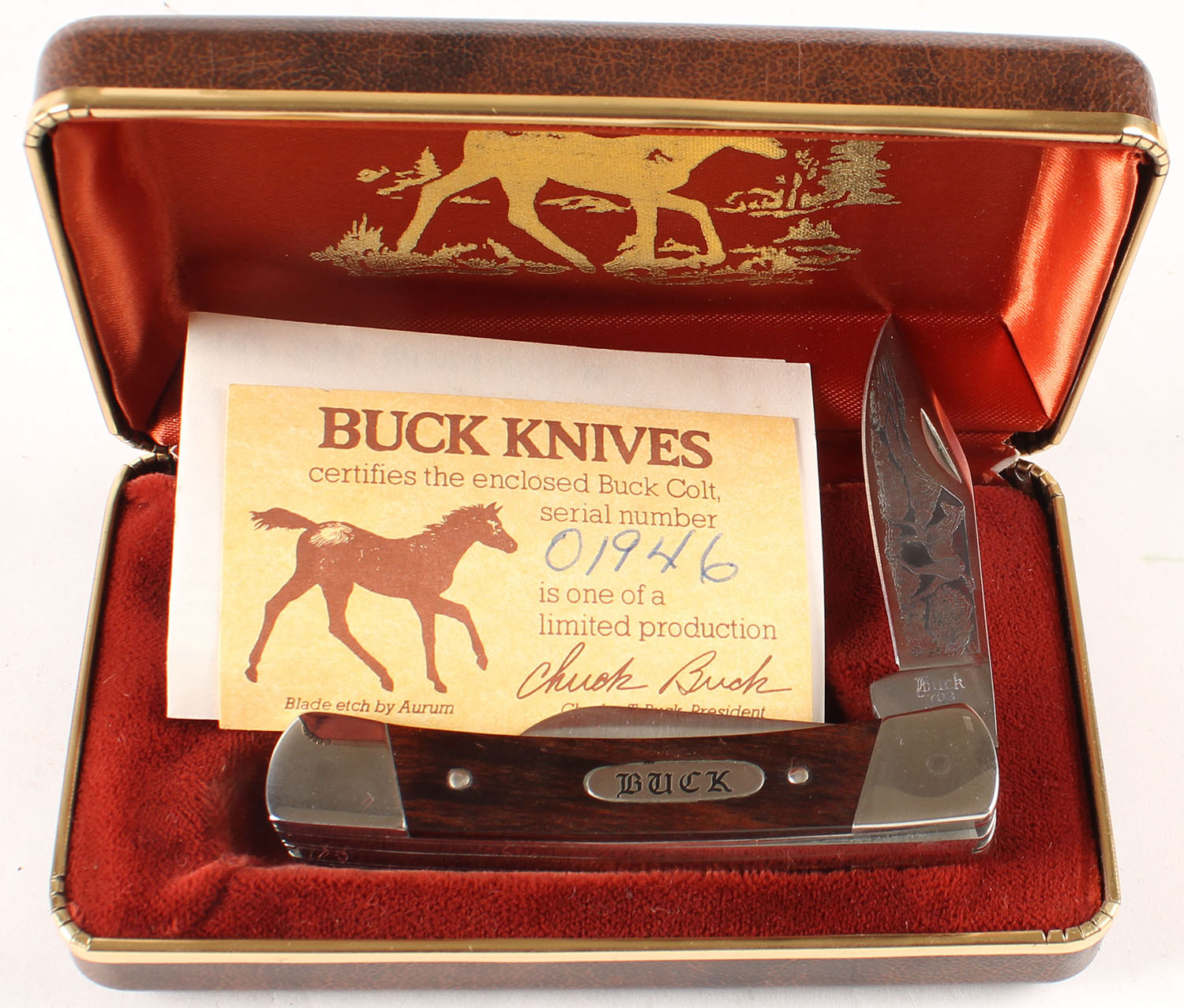 Buck knife folding blades in original box, has wood handle, 2 1/2'' blade, one blade has intricate design! # 01946, unused. Grade: MINT - Value: 50 to 100