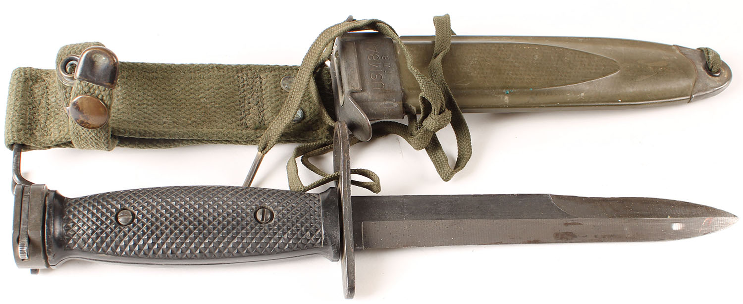 LISTING UPDATED 2/27/25: US, Bauer Ordnance Corp., M7 Bayonet & sheath. The blade has almost full finish coverage with wear from the sheath & scratches, blade also has spots of white corrosion. The guard & pommel retain full finish coverage with light wear from use. The black plastic grips have light wear. The top of the guard is marked ''U.S.M7'', ''BOG. The sheath has scratches, wear, & corrosion. The sheath is marked ''USM8A1'', ''TWB''. Grade: Very Good + - Value: 40 to 80
