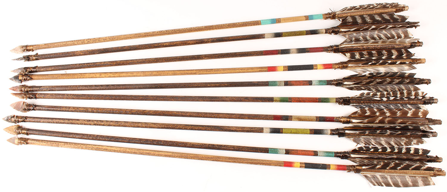 Large lot of handmade Native American arrows, flint tip with bird feathers and well made! Grade: Excellent - Value: 100 to 200