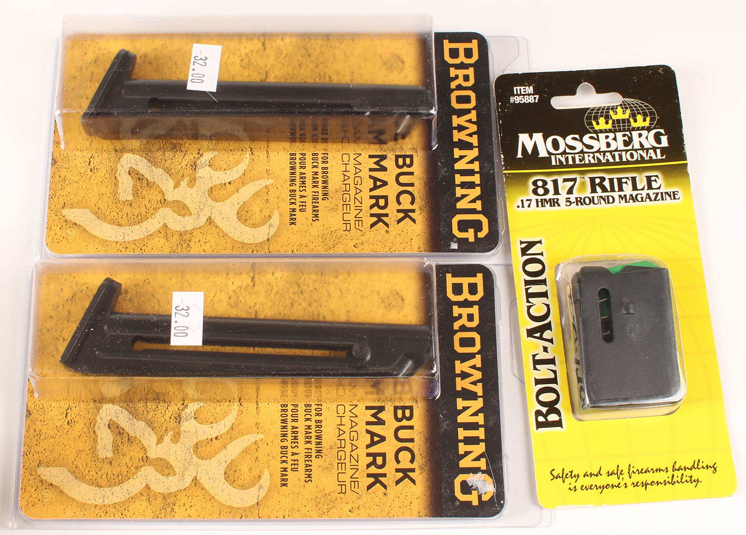 Lot of 3 mags., two Browning Buck Mark .22 LR pistol mags, and a Mossberg 817 rifle .17 HMR 5 rd mag. Grade: Excellent - Value: 40 to 100