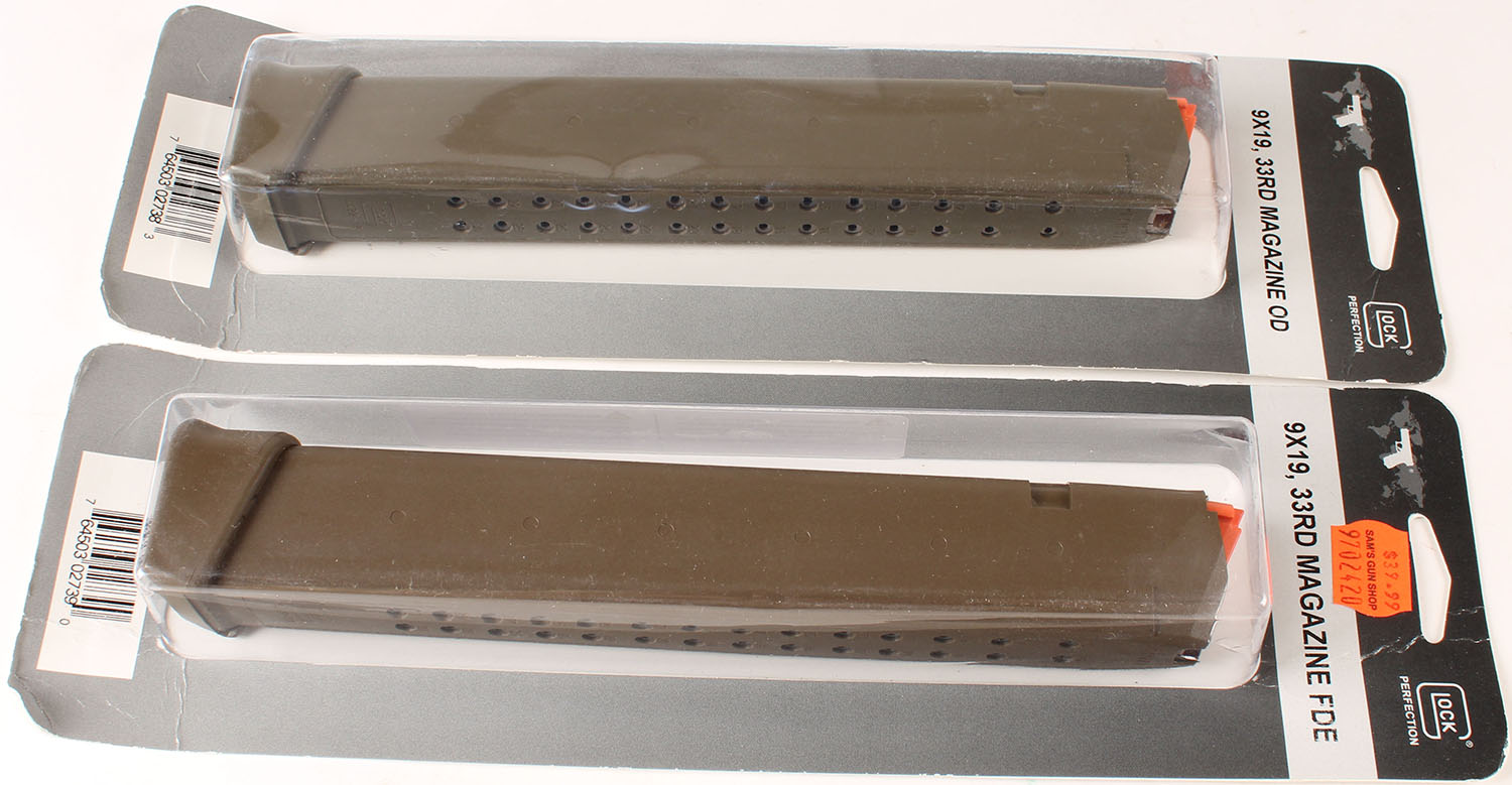 Lot of 2 Glock 9x19 33rd mag FDE/OD. Grade: Excellent ++ - Value: 30 to 90