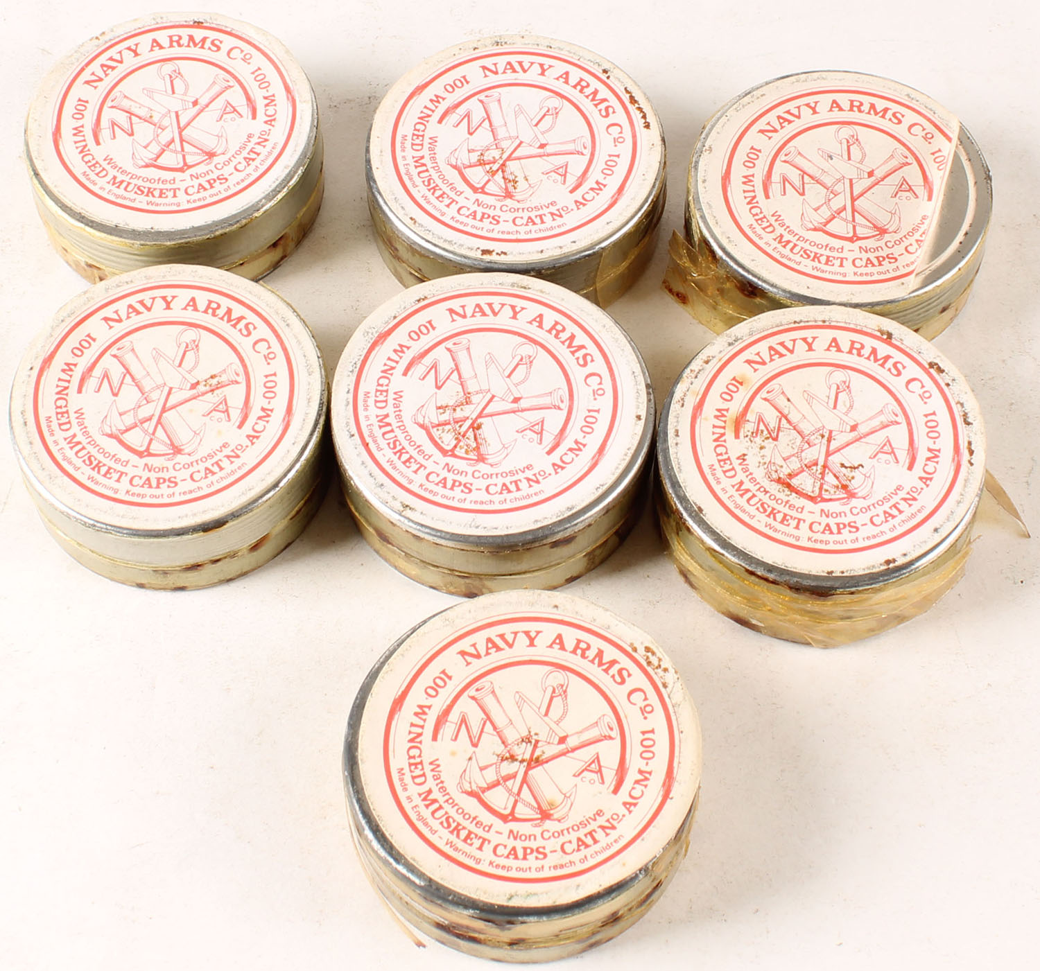 Lot of 7 Navy Arms Co., 100 winged musket cap tins, all are near full. Grade: Excellent - Value: 10 to 50