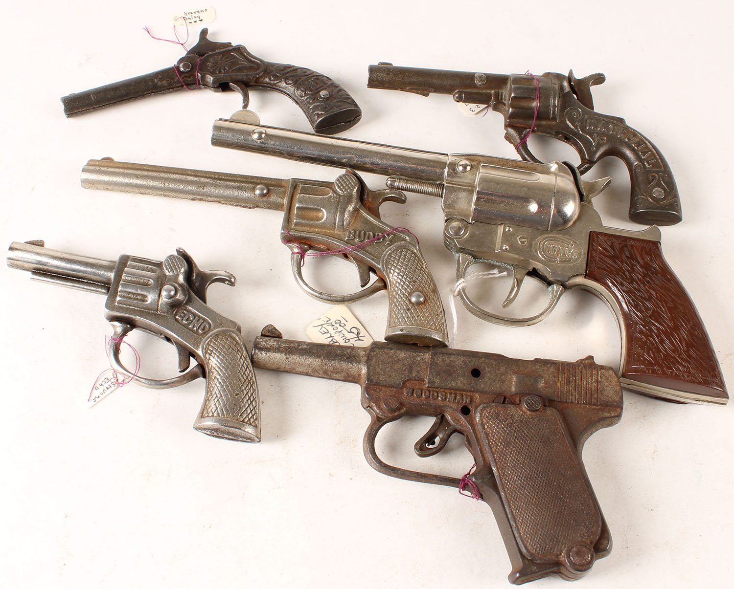 Lot of 6 Vintage Cap pistols, marked Stevens National, Stevens Echo, Stevens Buddy, Stevens Woodsman, Stevens Daisy. Grade: Very Good - Value: 50 to 300