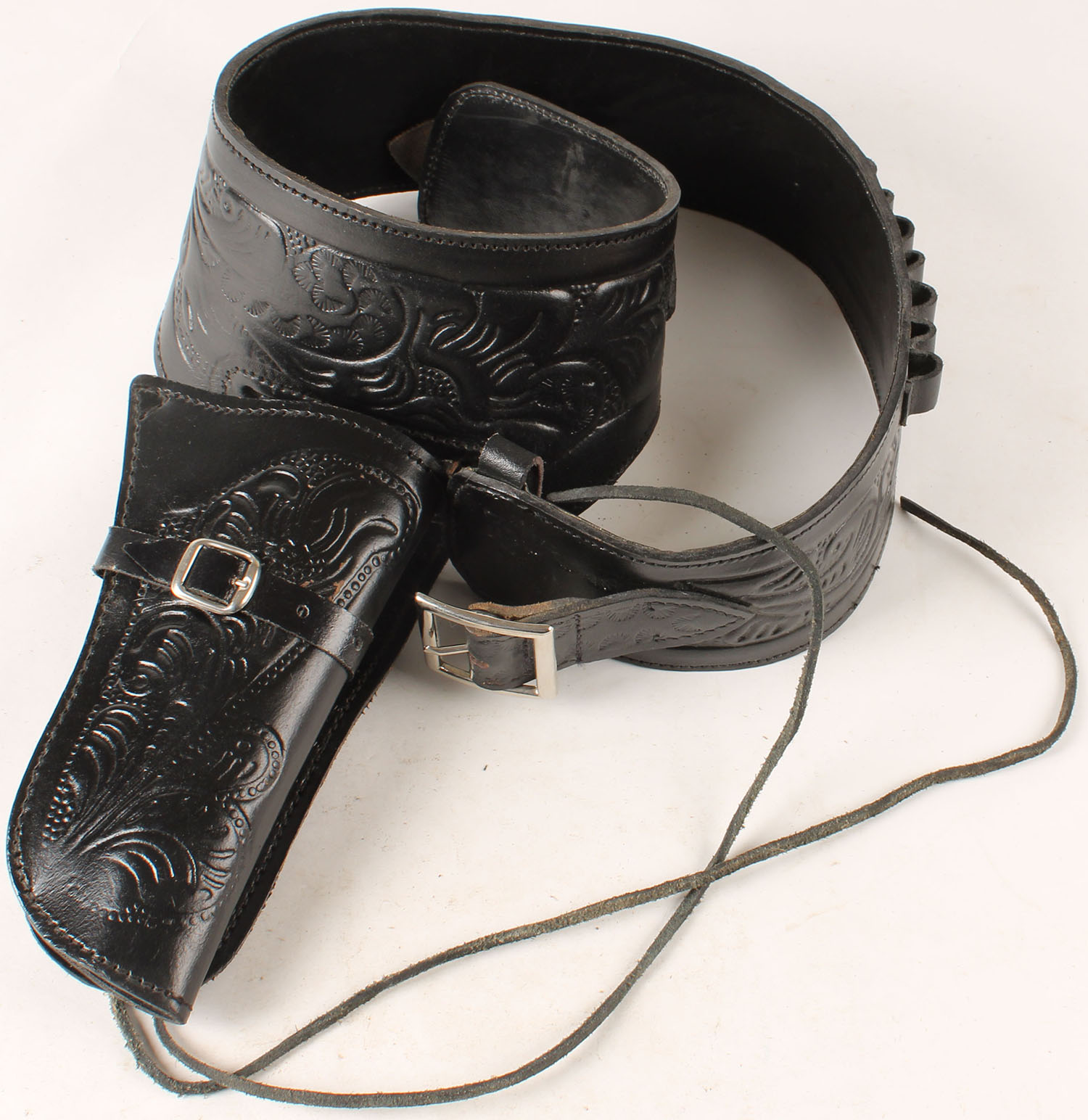 Unmarked wide leather ammo belt with holster, 36'' waist, has tooling. Grade: Excellent - Value: 4 to 50
