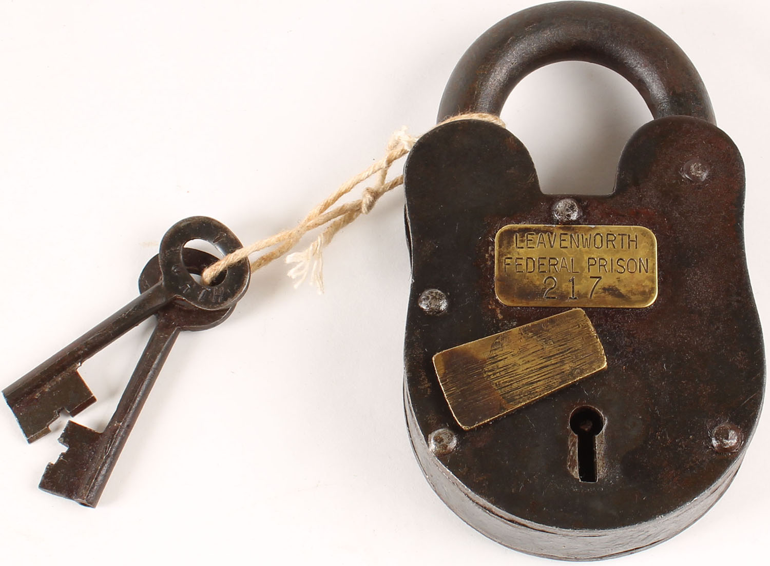 Heavy lock marked Leavenworth Federal Prison 217 with two keys. Grade: Very Good ++ - Value: 10 to 40
