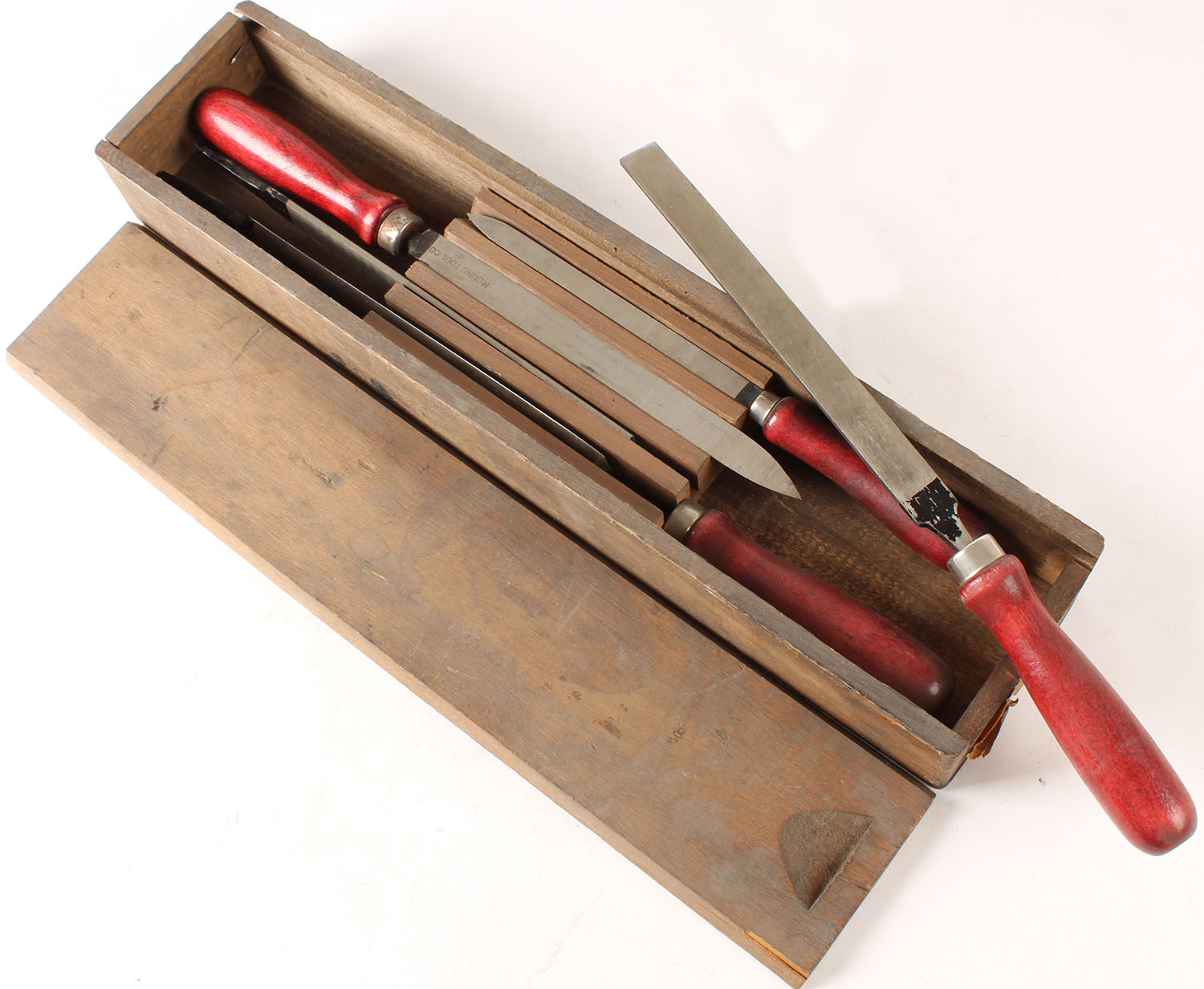 Complete set of 5 Machinists Scraping Tools made by Mound Tool Company. These tools are in the original box and appear to never have been used. The blades are as sharp as a razor and there are no nicks of any kind. They are in a nice vintage box. Grade: Very Good ++ - Value: 20 to 80